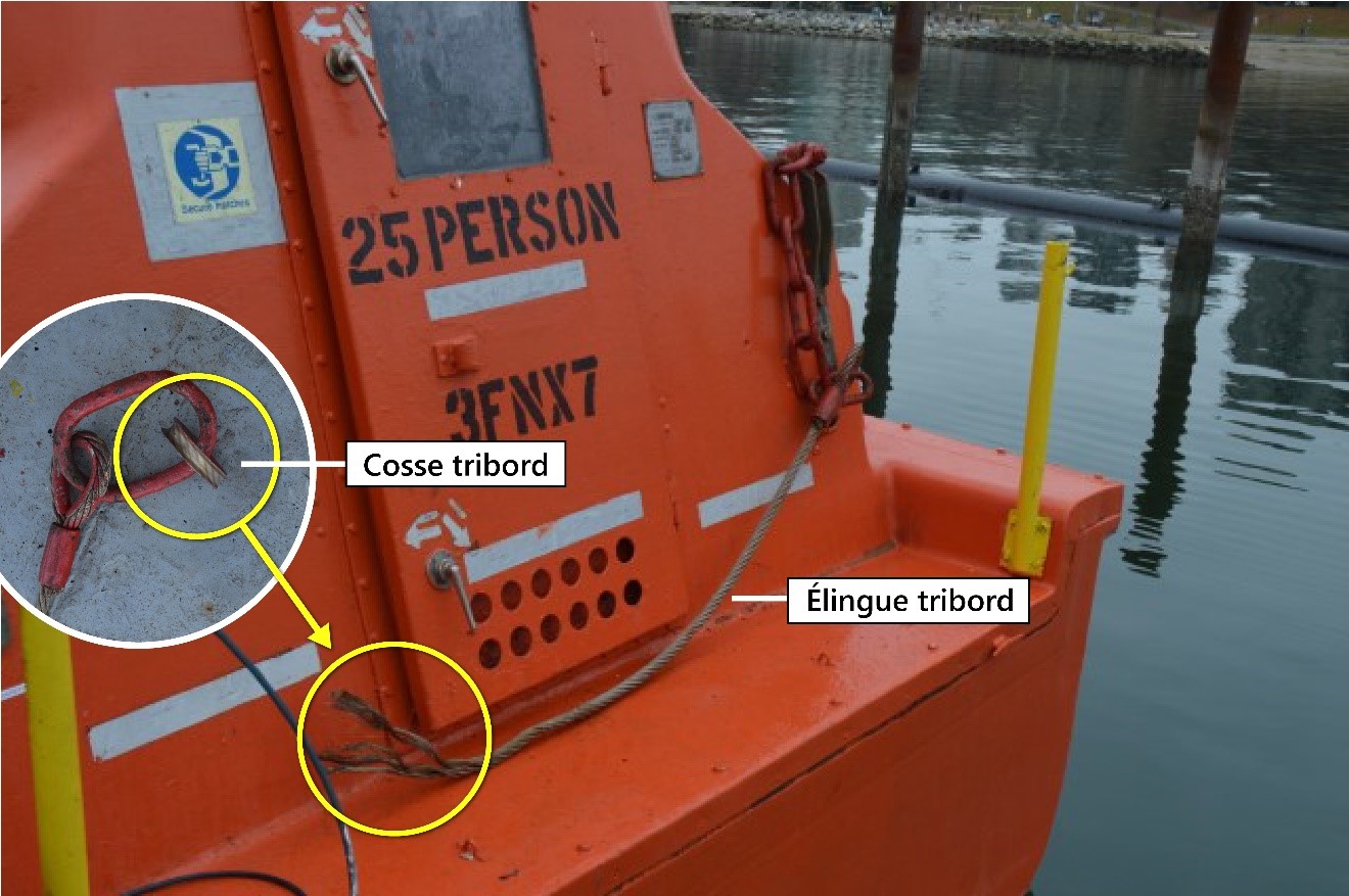 Les élingues étaient utilisées environ tous les 3 mois pour fixer l’embarcation de sauvetage au bossoir pendant les exercices. Une fois le croc de dégagement déverrouillé, seules les élingues empêchaient l’embarcation de sauvetage de tomber en chute libre. Ainsi, le bon état des élingues était essentiel à la sécurité de toute personne se trouvant dans l’embarcation de sauvetage.