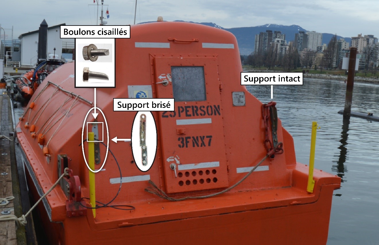 Une fois l’élingue tribord arrière rompue, l’effet de choc s’est déplacé vers les autres élingues, faisant en sorte que les manchons de sertissage des 2 élingues avant se rompent également. La charge s’est ensuite déplacée vers l’élingue bâbord arrière restante et son manchon, qui, bien que fissuré, est resté intact. Cependant, les boulons et le support bâbord arrière n’ont pas pu résister à la charge et ont été arrachés de l’embarcation de sauvetage par la force exercée sur l’élingue bâbord arrière.