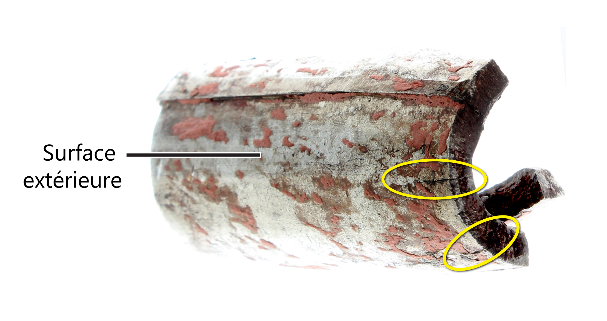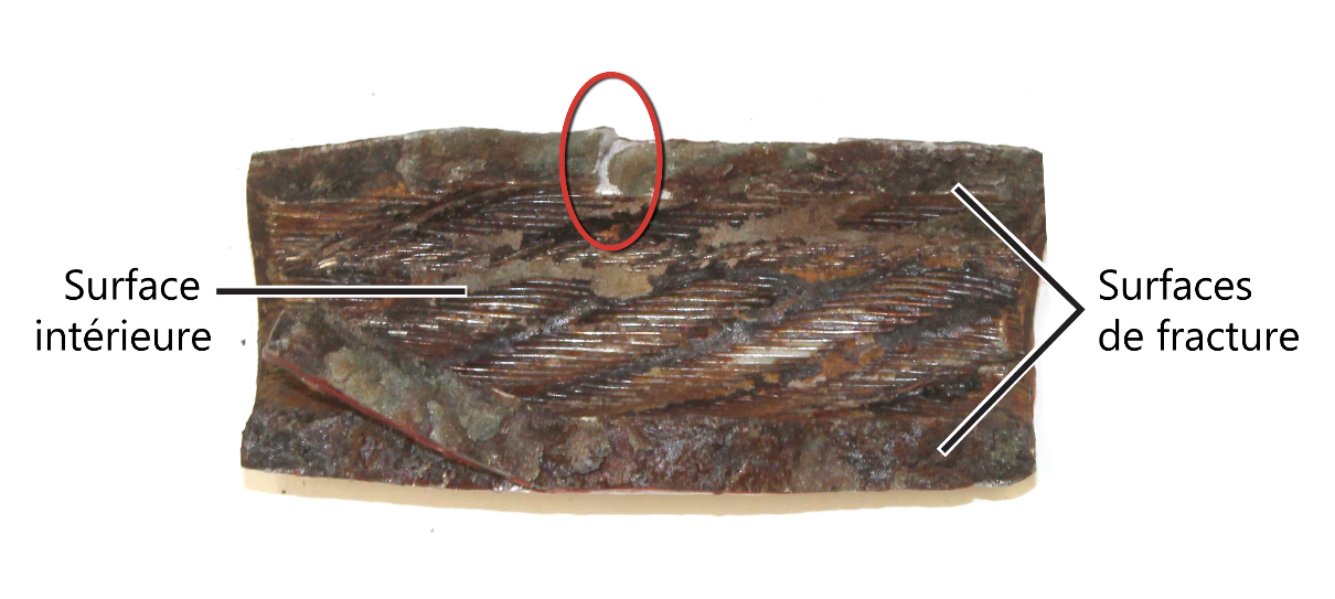 Les surfaces de fracture ont été examinées au moyen d’un microscope électronique à balayage. La majeure partie des surfaces étaient recouvertes d’une épaisse écaille de corrosion présentant une apparence de boue séchée. L’analyse de cette écaille a montré que celle-ci était principalement constituée d’oxyde de chrome, avec des traces de sodium, de chlore, de calcium et de soufre. La présence de ces éléments est cohérente avec une corrosion résultant d’un contact avec l’eau de mer ou l’air marin humide. Une certaine corrosion a également été observée sur la surface intérieure du manchon de sertissage.