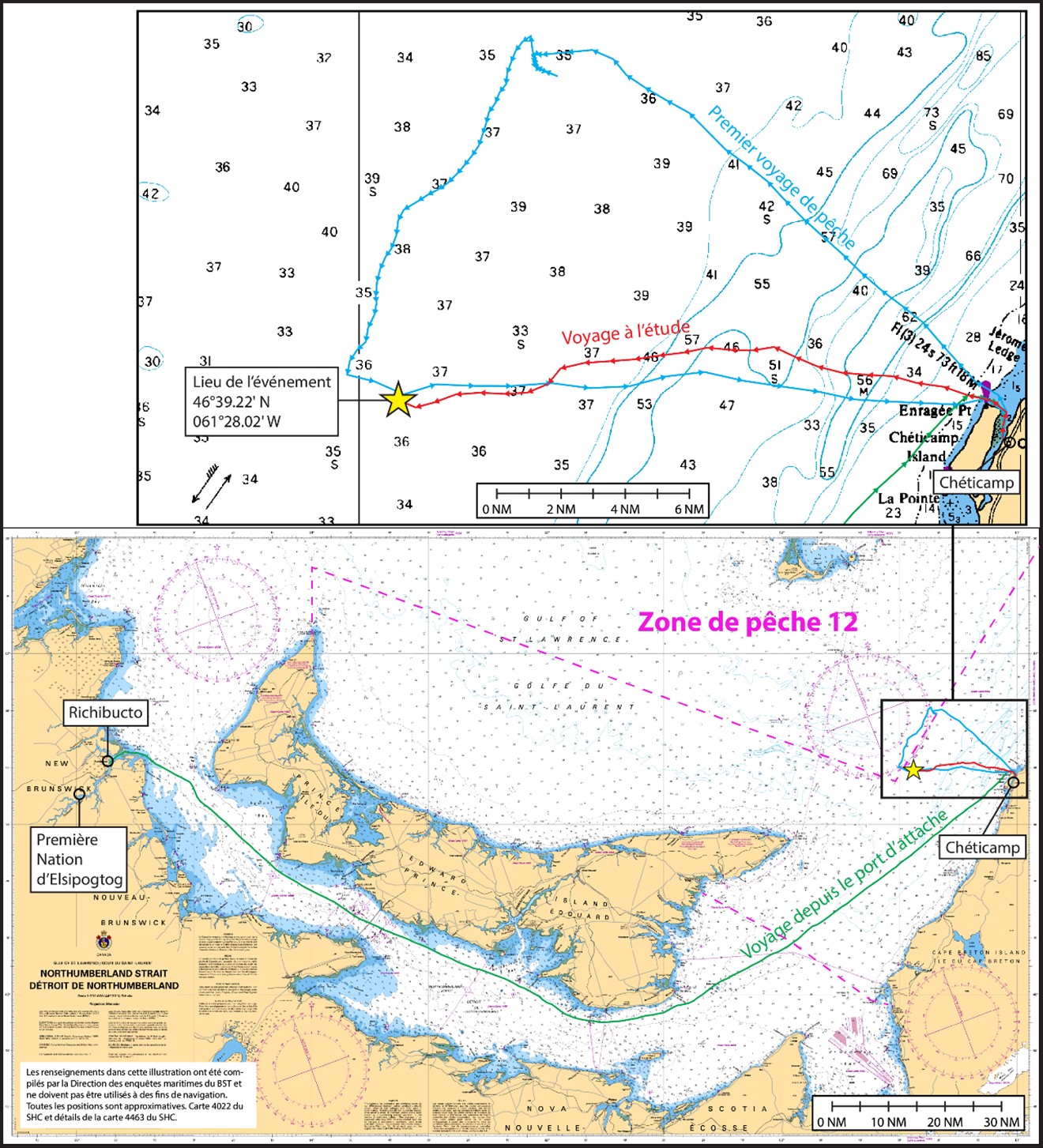Le 2 avril à 4 h 35, le capitaine et 4 membres d’équipage ont quitté Richibucto (Nouveau-Brunswick) pour se rendre à Chéticamp (Nouvelle-Écosse) à bord du Tyhawk pour la saison (figure 4), ce qui représentait un voyage d’environ 16 heures. Ils ont été rejoints à Chéticamp par 4 autres membres d’équipage, venus de Richibucto en voiture, soit un trajet d’environ 6 heures. Vers 20 h 30, le Tyhawk est arrivé à Chéticamp et tous les membres d’équipage ont commencé à charger le bateau.