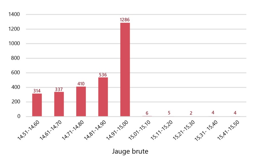 TC utilise la jauge brute d’un navire pour déterminer le niveau de surveillance et les normes de sécurité qui seront appliqués au navire. Lorsqu’on franchit le seuil de jauge brute de 15, il y a des différences importantes en ce qui concerne le niveau de surveillance et les normes de sécurité qui s’appliquent. L’enquête a permis de déterminer que les pêcheurs peuvent être fortement motivés à maintenir la jauge brute de leurs bateaux en deçà de 15 pour diverses raisons, notamment parce que les exigences réglementaires et la surveillance sont moindres. La répartition des jauges brutes dans le registre des bâtiments, qui fait état d’un grand nombre de bateaux juste en dessous d’une jauge brute de 15, le confirme.