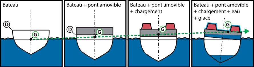 - Le pont amovible, les engins non arrimés et l’accumulation de pluie et de pluie verglaçante au-dessus de la ligne de flottaison ont eu pour effet d’élever le centre de gravité du bateau et de diminuer son franc-bord.