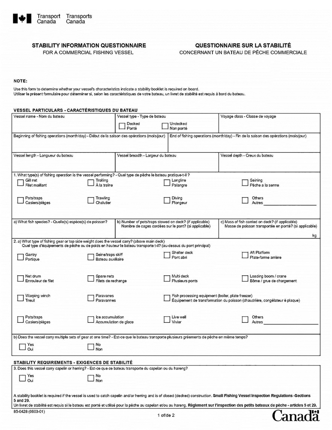 Conformément au Règlement sur la sécurité des bâtiments de pêche, des évaluations de la stabilité sont requises pour tous les nouveaux bâtiments de pêcheNote de bas de page 104 d’une longueur de plus de 9 m et pour ceux qui ont subi une modification importante ou un changement dans ses activités qui risque d’en compromettre la stabilitéNote de bas de page 105. La définition de TC d’une modification importante est la suivante :