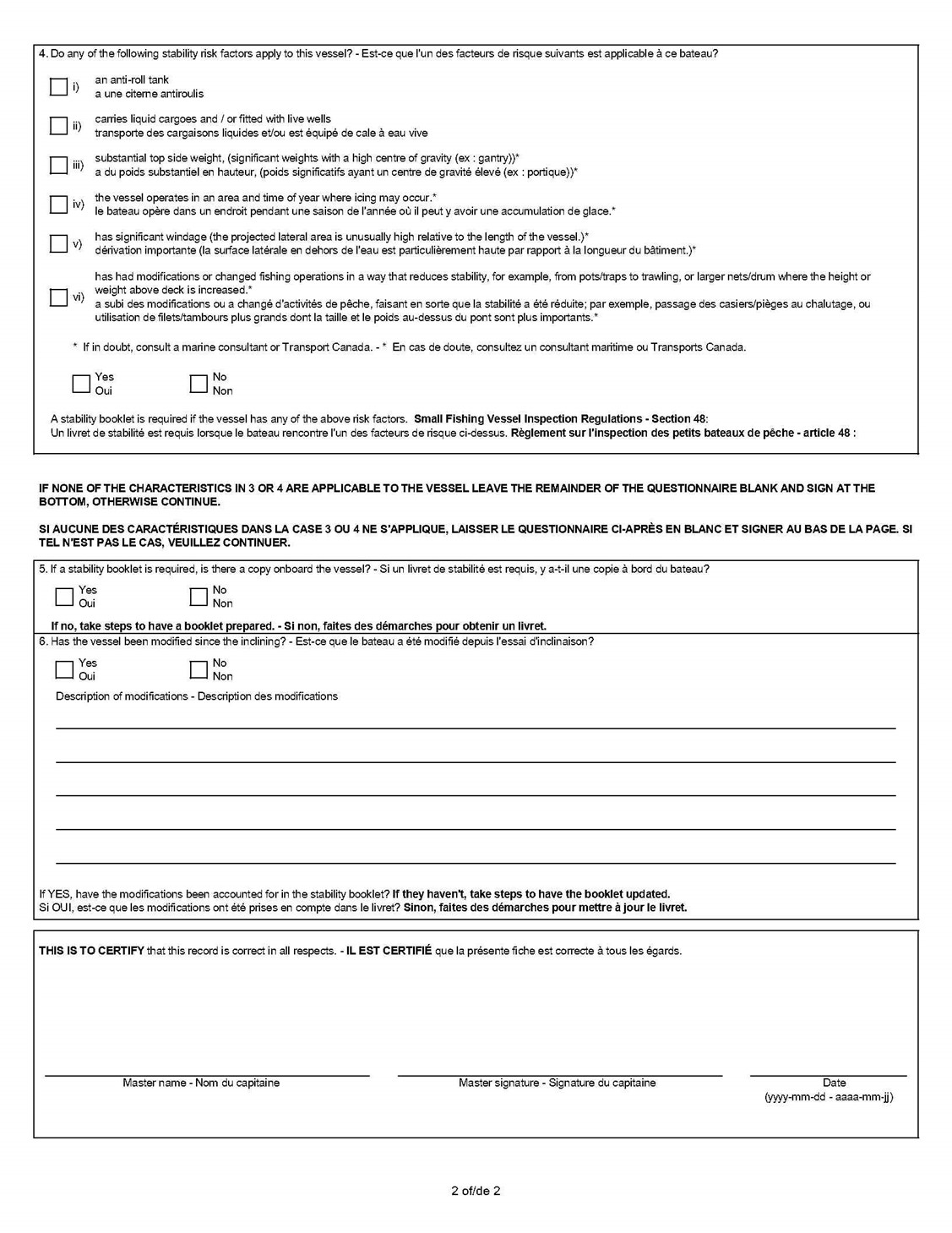 En ce qui concerne les petits bateaux de pêche et les autres petits bâtiments commerciaux (d’une jauge brute de 15 et moins) qui ne sont pas des navires à passagers, les définitions de « modification importante » (quelque chose qui « change considérablement » la capacité ou les dimensions d’un bâtiment de pêche) et les exigences relatives à une évaluation de la stabilité (quelque chose qui risque de compromettre la stabilité) sont qualitatives et sujettes à interprétation. Il incombe au représentant autorisé (RA) de déterminer si une modification est importante.