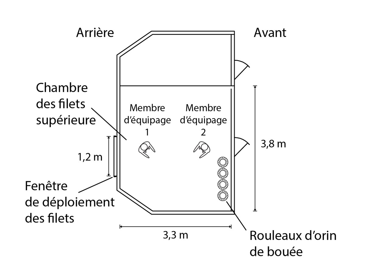 Les 2 membres d’équipage attendent près de la chambre des filets supérieure pendant que les filets se déploient, ce qui prend habituellement entre 20 et 30 minutes, selon le nombre de filets dans la tessure. Pendant ce temps, les 2 membres d’équipage regardent périodiquement dans la chambre des filets supérieure pour vérifier le déploiement des filets, afin de s’assurer qu’il n’y a pas d’accrocs et de déterminer quand ils devront retourner à la chambre des filets supérieure.