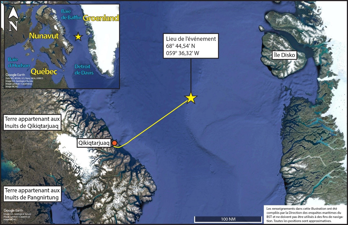 Le 26 août 2021 à 3 h 10, heure avancée de Terre-Neuve, un membre d’équipage du navire de pêche Suvak est passé par-dessus bord alors qu’il posait des filets maillants dans le détroit de Davis, à environ 120 milles marins au nord-est de Qikiqtarjuaq (Nunavut).