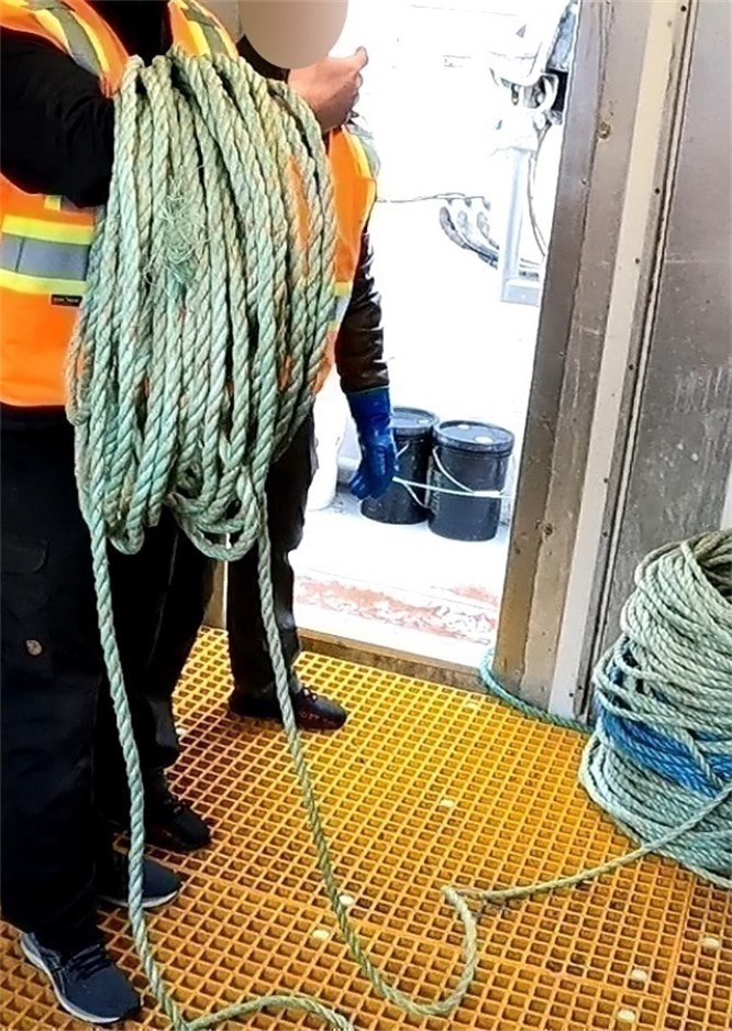 Le membre d’équipage 2 a ramassé une section de rouleau et l’a passée au membre d’équipage 1. Le membre d’équipage 1 lui a pris le rouleau et l’a jeté à l’eau. Lorsque le membre d’équipage 2 a ramassé la section de rouleau suivante, l’orin s’est resserré autour de son bras et il a été tiré vers la fenêtre de la chambre des filets supérieure. Le membre d’équipage 1 a tenté d’aider le membre d’équipage 2 en essayant de le tirer physiquement de la fenêtre pour l’empêcher de passer par-dessus bord.