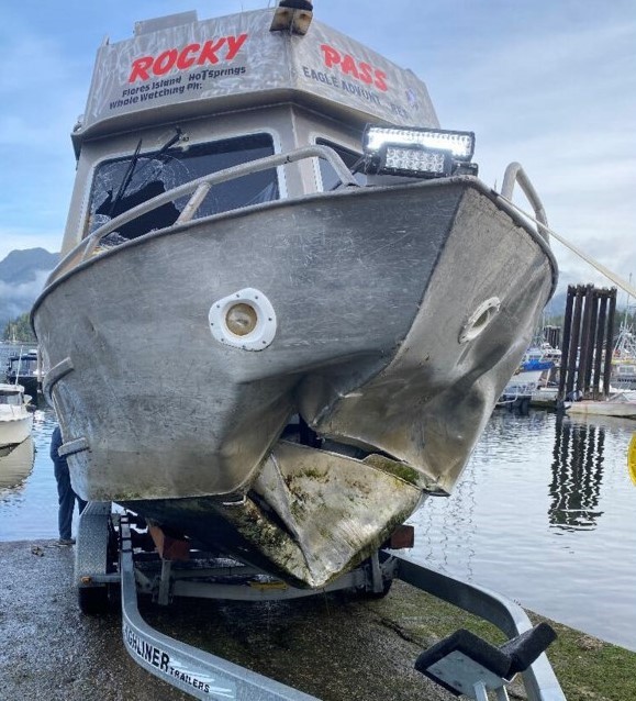 Des navires à proximité, la Garde côtière auxiliaire des Premières Nations côtières et la Garde côtière canadienne ont répondu à l’appel de détresse Mayday. Le conducteur et les 4 passagères ont reçu les premiers soins et ont été transportés à l’hôpital de Tofino. Le Rocky Pass, dont l’étrave avait été perforée par l’impact avec le rocher (figure 2), a été remorqué à Tofino.