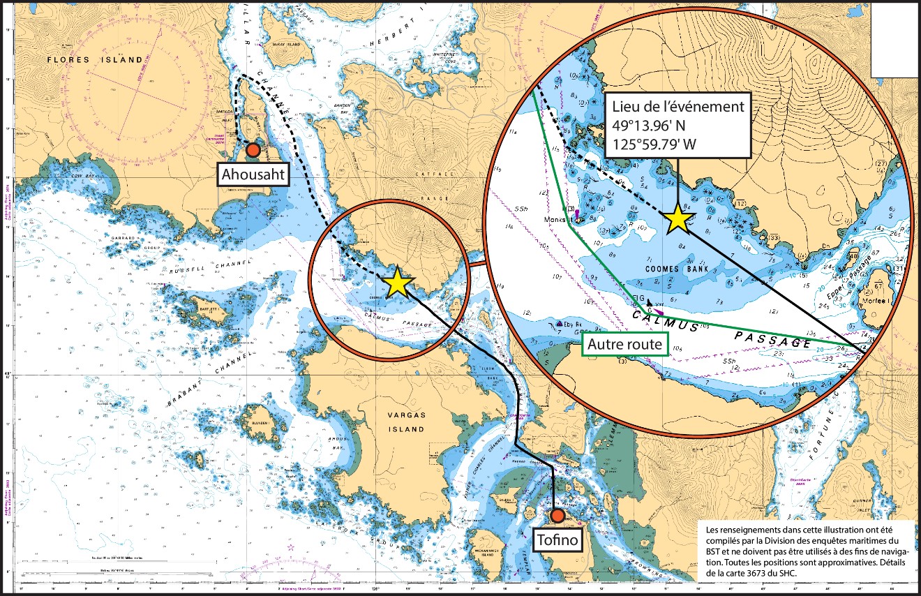 Un autre bateau-taxi avait quitté Tofino pour se rendre à Ahousaht à peu près en même temps que le Rocky Pass. Il y avait également 2 autres bateaux-taxis en route vers TofinoNote de bas de page 2. Le conducteur du Rocky Pass a emprunté la route habituelle des bateaux-taxis exploités dans la région. La route traverse le banc Coomes, qui comporte de nombreuses zones peu profondes et des rochers découvrantsNote de bas de page 3. Le conducteur a maintenu le Rocky Pass à quelques mètres à droite de la trajectoire habituelle pour laisser de la place au trafic en sens inverse. Il naviguait à l’aide du GPS alors que le bateau avançait à environ 22 nœudsNote de bas de page 4.