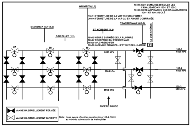 La TCPL a pris la décision de déroger à l'article 04-07 de son manuel des procédures d'urgence après consultation entre le contrôleur de Calgary, le COR et le gestionnaire adjoint du centre de Calgary. On a jugé plus prudent d'isoler les canalisations 100-1 et 100-2 puisque la station de comptage des ventes de St. Norbert est raccordée à ces deux canalisations et que l'une ou l'autre pouvait avoir été touchée lors de la rupture. Il a donc été décidé d'isoler les canalisations 100-1 et 100-2 seulement entre les stations 34 et 41 pour les raisons suivantes :