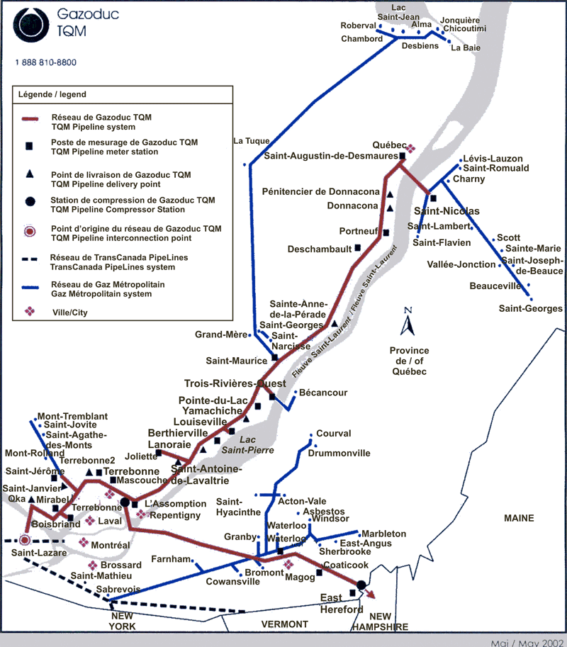Le gazoduc de TQM commence à Saint-Lazare (Québec) où le gazoduc de TCPL achemine le gaz naturel depuis le bassin sédimentaire de l'Ouest canadien. Le gaz naturel est alors acheminé grâce à l'un des deux gazoducs à haute pression de TQM vers Québec (Québec) et tous les points intermédiaires. Le deuxième gazoduc à haute pression de TQM fournit le New Hampshire, aux États-Unis. Désigné sous le nom de canalisation 3000, ce gazoduc reçoit le gaz naturel à Terrebonne (Québec) (anciennement Lachenaie, Québec) et l'achemine à East Hereford qui, par l'entremise du Portland Natural Gas System (PNGS) le livre ensuite aux consommateurs de l'est des États-Unis (voir l'annexe A). L'Office national de l'énergie (ONE) a autorisé une pression manométrique maximale de service de 9 928 kPa pour la canalisation 3000. En fonctionnement normal, la pression de service de ce gazoduc varie entre 4 000 kPa et 9 928 kPa. La date de mise en service initiale de la station d'East Hereford est le 17 décembre 1999.