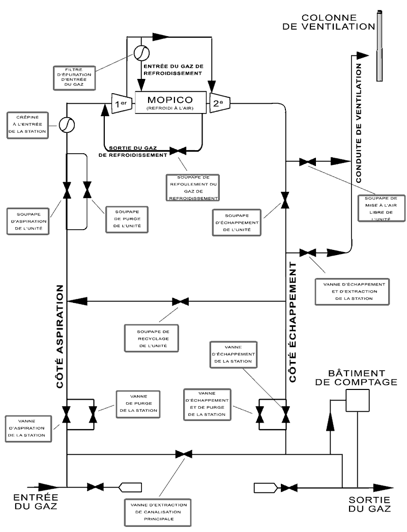 - Purge sous pression d'urgence de l'unité : réaction à une condition non maîtrisée à la station, déclenchée par un opérateur ou par une alarme, telle que définie par la Matrice des causes et effets de l'arrêt d'urgence de la station. Elle provoque l'arrêt total d'urgence du MOPICO en déclenchant le système d'entraînement à fréquence variable et en ouvrant ensuite les soupapes de mise à l'air libre de l'unité, après fermeture des soupapes d'aspiration et de refoulement du MOPICO, pour évacuer le gaz naturel des conduites du MOPICO seulement.