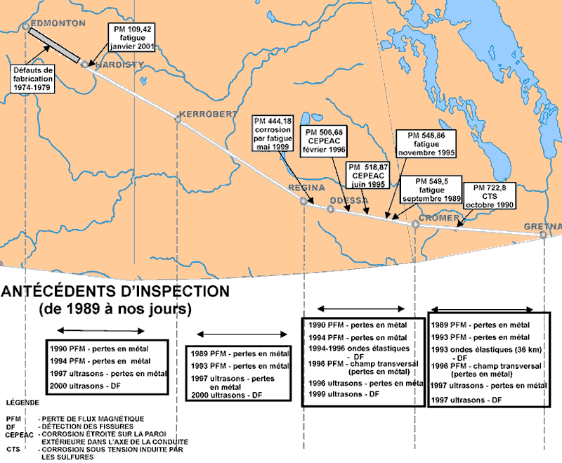 En 1996-1997, l'entière conduite entre Edmonton et Gretna a été inspectée à l'aide d'un outil de détection des pertes en métal fonctionnant aux ultrasons, et des travaux d'excavation ont été effectués en 1997-1998. En septembre 1997, un outil de détection des fissures utilisant les ultrasons a été passé dans les segments de la canalisation de 864 mm entre Cromer et Gretna qui n'avaient pas encore été inspectés à l'égard des fissures. Des travaux d'excavation ont été effectués à 18 endroits en 1998 en fonction de l'analyse des données sur l'inspection interne.