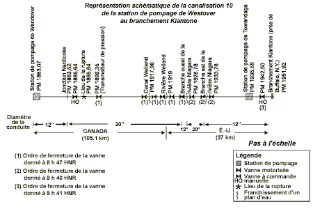 À 8 h 36, l'OCC note une chute de pression au transmetteur de pression situé au poteau milliaire 1896, à 17 km en aval du lieu de la rupture. Dans les huit minutes qui suivent le moment de la rupture, l'OCC commande l'« arrêt » des pompes aux stations de pompage de Westover et de Tonawanda, les stations situées respectivement en amont et en aval du poteau milliaire 1896, et il commence à isoler la canalisation qui les relie. À 8 h 54, l'OCC remarque que la vanne d'isolement du poteau milliaire 1896 est coincée et il demande au préposé à l'entretien de garde d'en vérifier l'état. Le préposé recherche les anomalies liées à la pression à Westover, et ferme les vannes à commande manuelle en commençant par Westover. À 10 h 3, le superviseur du secteur de Westover localise la rupture au poteau milliaire 1885,64 et prend des mesures pour assurer la sécurité des lieux. On demande au préposé à l'entretien de garde d'aider à assurer la sécurité sur les lieux de la rupture avant de continuer vers le poteau milliaire 1896. Au poteau milliaire 1896, on ferme la vanne à l'aide d'une manivelle à 11 h 17. En général, le poteau milliaire 1896 et les emplacements situés en aval sont moins élevés que les installations sur les lieux de la rupture, ce qui permet un certain drainage du contenu de la conduite pendant que la vanne du poteau milliaire 1896 reste ouverte. L'annexe A montre une représentation schématique de la canalisation 10.