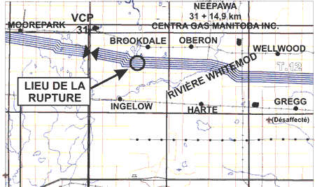 Vers 23 h, heure avancée du CentreNote de bas de page 1, il y a eu rupture de la canalisation 100-3 (canalisation principale) du gazoduc de 914 millimètres (mm) de la TransCanada PipeLines (TransCanada), à la vanne de canalisation principale (VCP) 31-3 + 5,539 kilomètres (km), à quelque 2 km du village de Brookdale (Manitoba).