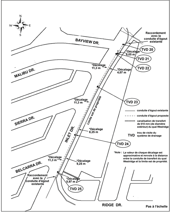 - la conduite d'égout devait être parallèle au pipeline Westridge et avoir un dégagement d'au moins 1,5 m;