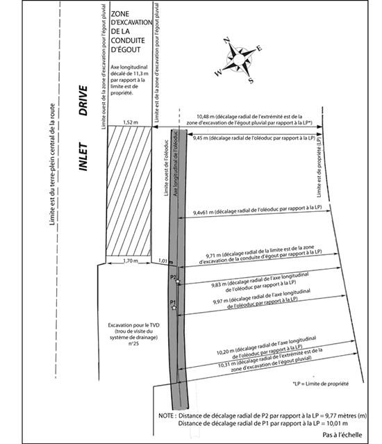 Le consultant a terminé les dessins de conception, numérotés Révision 1 (Rev. 1), dans lesquels on voyait la position de la conduite d'égout proposée, des branchements latéraux, des TDV et du pipeline Westridge. Les plans prévoyaient de donner à la conduite d'égout proposée la même pente que celle de la conduite combinée existante d'égout pluvial/sanitaire et indiquaient qu'elle serait située au-dessus du pipeline Westridge et parallèle à celui-ci. On devait construire 18 branchements latéraux et 6 TVD le long de cette voie, afin de relier les puisards en bordure de rue à la conduite d'égout proposée, laquelle ne croisait pas le pipeline Westridge. Seuls les 18 branchements latéraux proposés et les 6 puisards proposés croisaient le pipeline. La position du pipeline Westridge sur les dessins de conception tenait compte de renseignements provenant de sources variées, dont le plan d'après exécution du pipeline de la KMC, qui indiquait un décalage de 8,5 m de l'axe longitudinal du pipeline Westridge par rapport à la limite est de propriété d'Inlet Drive. L'axe longitudinal de la conduite d'égout proposée était décalé de 11,3 m par rapport à cette limite de propriété, résultant en une séparation constante de 2,8 m de l'axe longitudinal par rapport au pipeline Westridge, à l'intérieur de la zone interdite de 3 m autour du pipeline. L'accord de croisement ne renvoyait pas aux exigences réglementaires de l'Office national de l'énergie (ONÉ) relativement à une zone interdite temporaire de 3 m de part et d'autre du pipeline, dans laquelle tout creusage mécanique était interdit jusqu'à ce qu'on ait localisé le pipeline avec précision, soit en creusant à la main ou en utilisant d'autres méthodes de creusage.