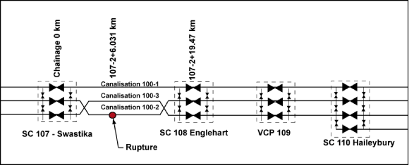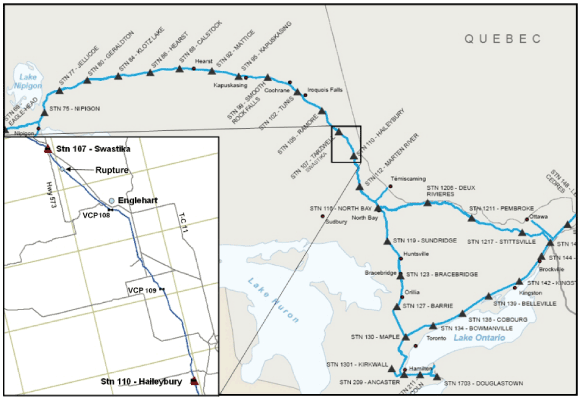 Le 12 septembre 2009, vers 12 h 6, heure avancée de l'Est, le service d'incendie d'Englehart avise le centre de contrôle d'acheminement du gaz de TransCanada par le truchement de sa ligne de notification en cas d'urgence qu'une explosion suivie d'un incendie s'est produite au sud de la station de compression 107 de la compagnie, située près de Swastika (Ontario). Au moment de l'événement, TransCanada transporte du gaz naturel doux. Le gaz qui s'échappait d'une rupture du gazoduc s'était enflammé, ce qui a causé l'explosion. Celle-ci a créé un grand cratère et deux tronçons de conduite se sont détachés du réseau, l'une d'entre elles étant projetée à environ 150 mètres du lieu de la rupture. Il n'y a pas eu de blessés.