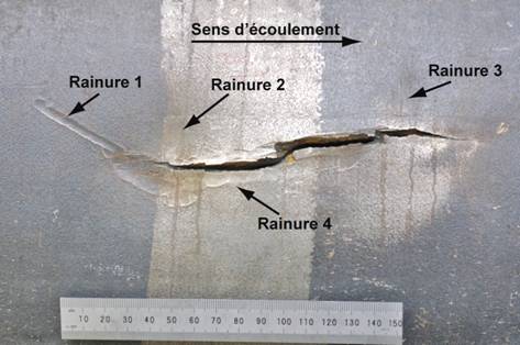 - La fuite s'est produite dans une fissure de 160 mm de longueur associée à une bosselure et une rainure qui se trouvaient à la position 6 heures sur la conduite. La bosselure avait une profondeur maximale de 3,1 mm (0,51 p. 100 du diamètre de la conduite).