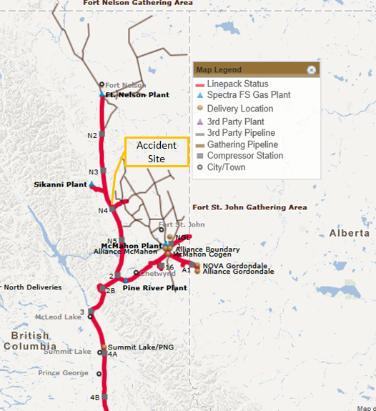 Spectra transporte du gaz naturel depuis son usine à gaz de Fort Nelson jusqu’à la frontière canado-américaine. Le tronçon de gazoduc qui relie l’usine de Fort Nelson à la station CS-2 a une capacité de 50,72 millions de mètres cubes (1,8 milliard de pieds cubes) de gaz par jour. Ce tronçon compte également 4 stations de compression intermédiaires (CS-N2, CS-N3, CS-N4 et CS-N5). Au moment de l’événement, 2 stations de compression suffisaient à assurer la demande de production et de fourniture.