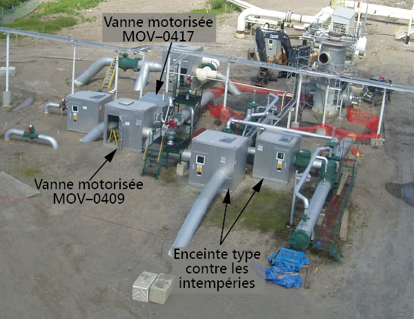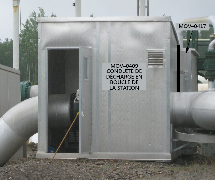 L’accident s’est produit à l’intérieur de l’enceinte de protection contre les intempéries qui abritait la vanne motorisée 0409 (MOV-0409) (figure 2). Cette vanne motorisée commande le débit de la conduite de décharge en boucle du gazoduc de 91,44 cm (36 pouces) de la station de compression.