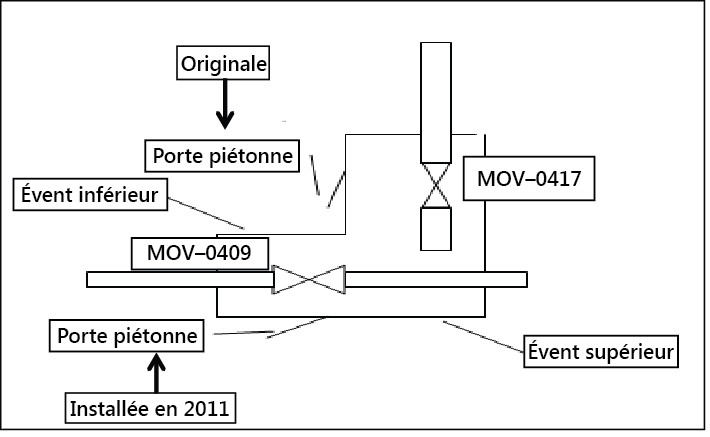 - Une porte de sortie a été ajoutée à l’enceinte de la vanne MOV-0409. Cette porte n’était pas dotée d’une prise d’essai pour vérifier la qualité de l’air (photo 2).