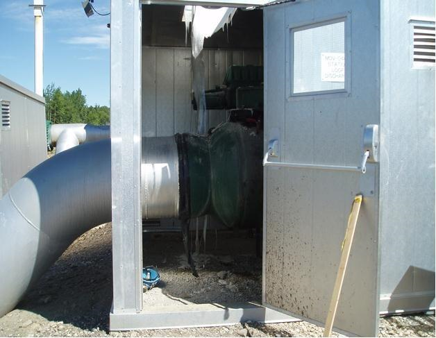 En 1993, les vannes MOV-0409 et MOV-0417 (en service depuis les années 1960) ont été recouvertes d’enceintes de protection contre les intempéries. Les 2 enceintes ont un mur en commun dans lequel se trouve une ouverture permettant l’accès entre les 2 enceintes par l’intérieur (figure 3). La vanne MOV-0409 commande le débit de la conduite de décharge en boucle du gazoduc de 91,44 cm (36 po), et la vanne MOV-0417 commande le débit de la conduite de purge d’urgence de la station de compression. Ces 2 vannes sont munies d’un mécanisme de commande à moteur électrique à courant continu de 130 volts logé dans le carter de l’interrupteur de fin de course. Il n’y a aucun autre appareil électrique dans ces enceintes. Dans des conditions de fonctionnement normales, la vanne MOV-0409 est en position d’ouverture totale, c’est-à-dire que le gaz haute pression circule dans la vanne sans interruption. Si une séquence d’arrêt d’urgence est déclenchée à la station de compression, la vanne MOV-0409 passe automatiquement en position de fermeture totale. Les travaux d’entretien sur la vanne MOV-0409 nécessitaient la mise sous pression de la conduite.