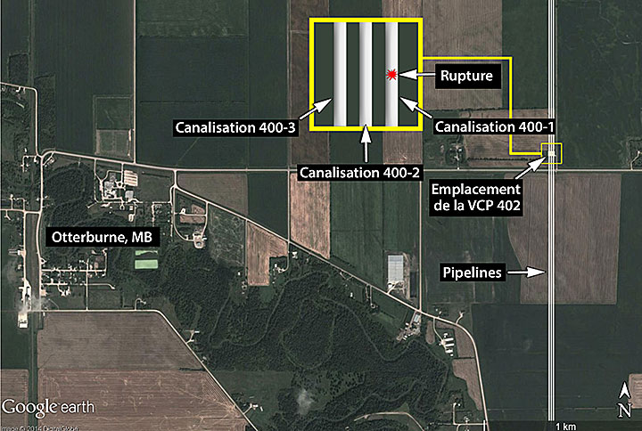 Le lieu de l'événement se trouve sur la canalisation 400-1 de TransCanada à la hauteur de la vanne de canalisation principale (VCP) 402, à environ 50 km au sud de Winnipeg (Manitoba). Il est entouré de terres agricoles planes. La zone est peu peuplée, l'habitation la plus proche se trouvant à environ 540 mètres à l'est. La route la plus proche est l'autoroute provinciale 303 située à environ 75 mètres au sud. La population du village le plus proche, Otterburne (Manitoba), est de 120 personnes (figure 1).