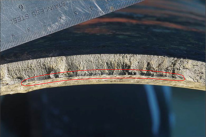 - La conduite a cédé à la hauteur d'une fissure préexistante, présente dans la zoneNote de bas de page 6 d'un joint circulaire fragilisé par la chaleur, situé au nord de la VCP 402-1 (photo 2). Ce joint reliait le pipeline au té de dérivation. Le té de dérivationNote de bas de page 7 a été installé en 1960 dans le cadre de la construction originale.