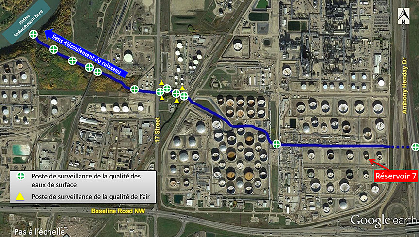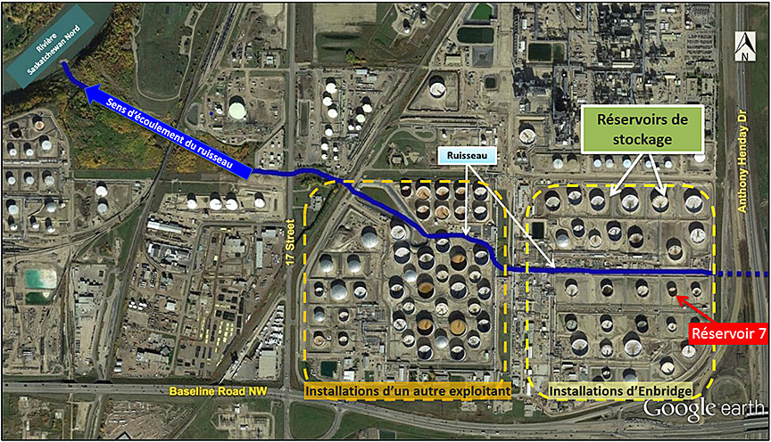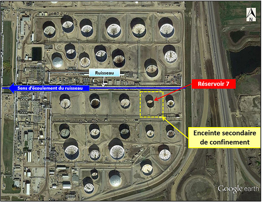 Le réservoir 7 (le réservoir) est un des réservoirs de stockage de pétrole brut au terminal Edmonton North d'Enbridge. Il est situé dans une enceinte secondaire de confinement adjacente à la rive sud du ruisseau (figure 6). Le réservoir a un diamètre de 33,5 m et une hauteur de 14,6 m; il a une capacité nominale d'environ 12 700 m³.
