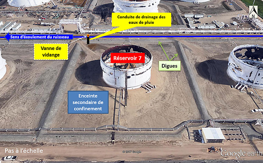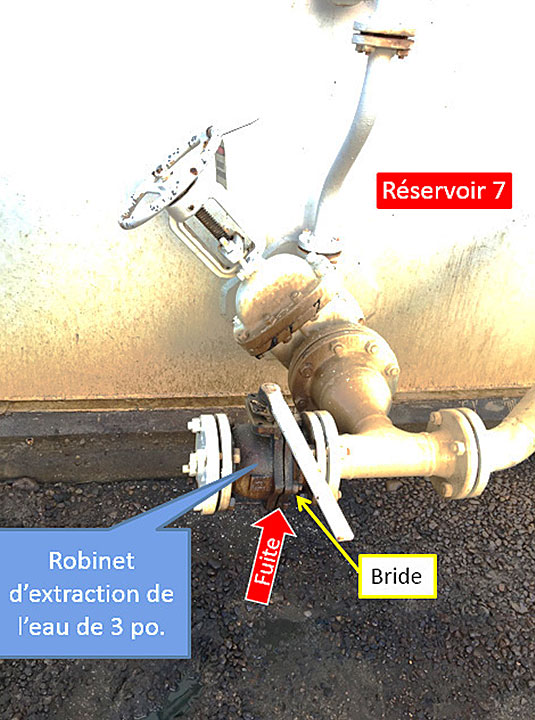 - La fuite s'est produite lorsque du pétrole brut du réservoir 7 s'est déversé dans l'enceinte secondaire de confinement en passant par la bride qui reliait les 2 moitiés d'un robinet à tournant sphérique de 3 pouces qui fait partie du système d'évacuation de l'eau du réservoir.