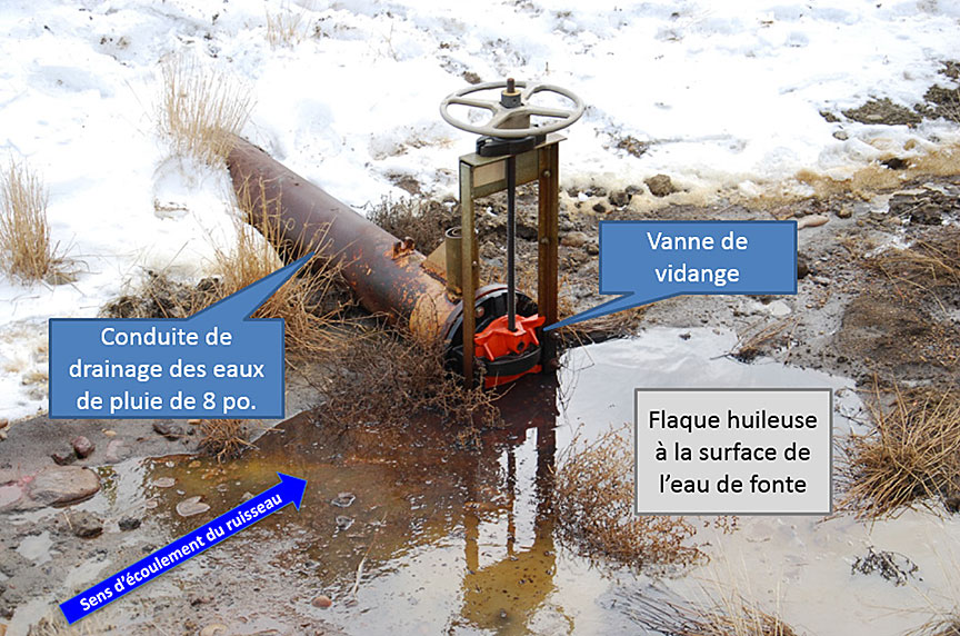 - Environ 3 m³ de produit retenu dans l'enceinte s'étaient échappés dans le ruisseau par le réseau de drainage des eaux de pluie de l'enceinte, qui se compose d'une conduite de drainage des eaux de pluie de 8 pouces munie d'une vanne de vidange de 8 pouces (figure 4).