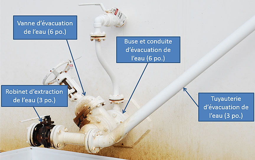 - une vanne d'évacuation de l'eau : vanne à commande manuelle de 6 pouces qui contrôle l'écoulement du produit en provenance de la conduite d'évacuation de l'eau;