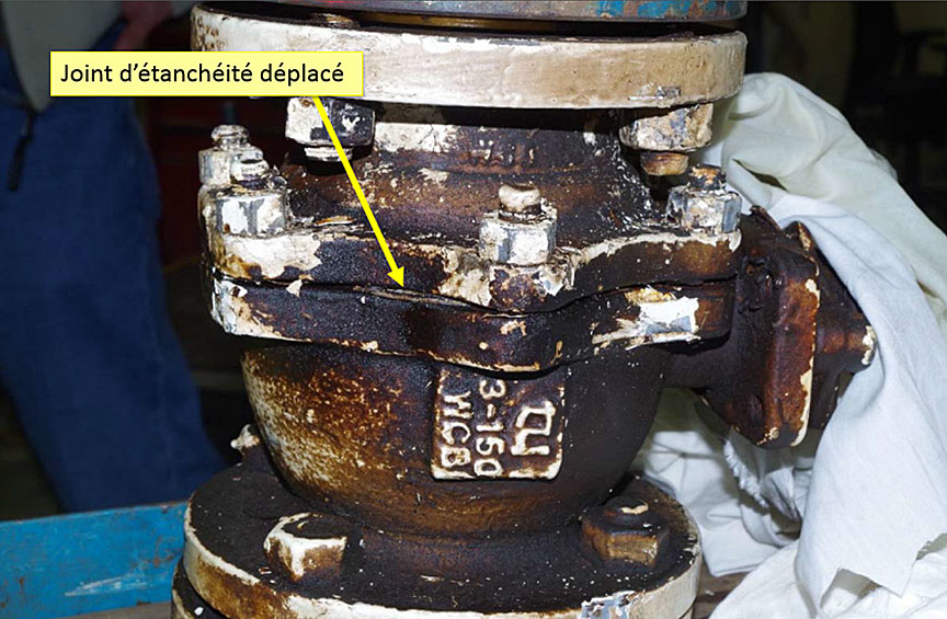 - Le joint d'étanchéité entre les 2 sections du corps du robinet à tournant sphérique de 3 pouces s'était déplacé de sa position d'origine.