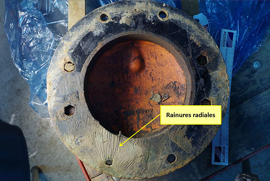 - La bride de la vanne, à l'endroit où elle est fixée à la conduite de drainage, était recouverte d'une couche relativement lisse de boue. Des rainures radiales sur la couche de boue laissent croire que de l'eau s'était probablement écoulée à cet endroit (figure 11).