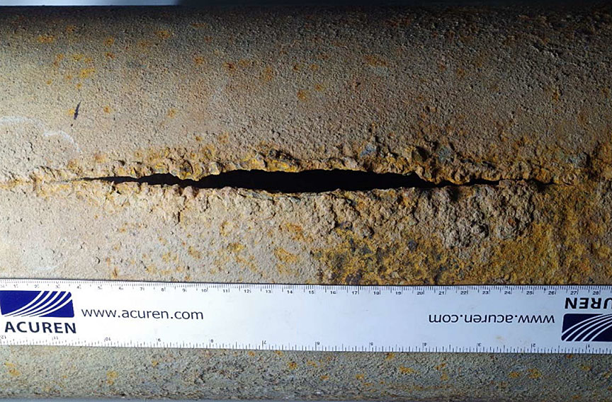 - La conduite de drainage n'était pas étanche aux liquides au moment de sa fabrication en raison d'un certain nombre de trous dans le joint longitudinal soudé. Il n'a pas été possible de déterminer si ceci avait contribué à la fuite.