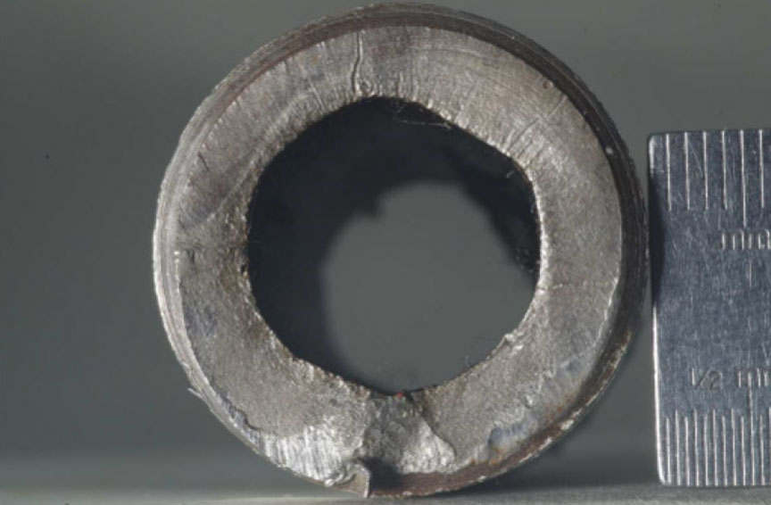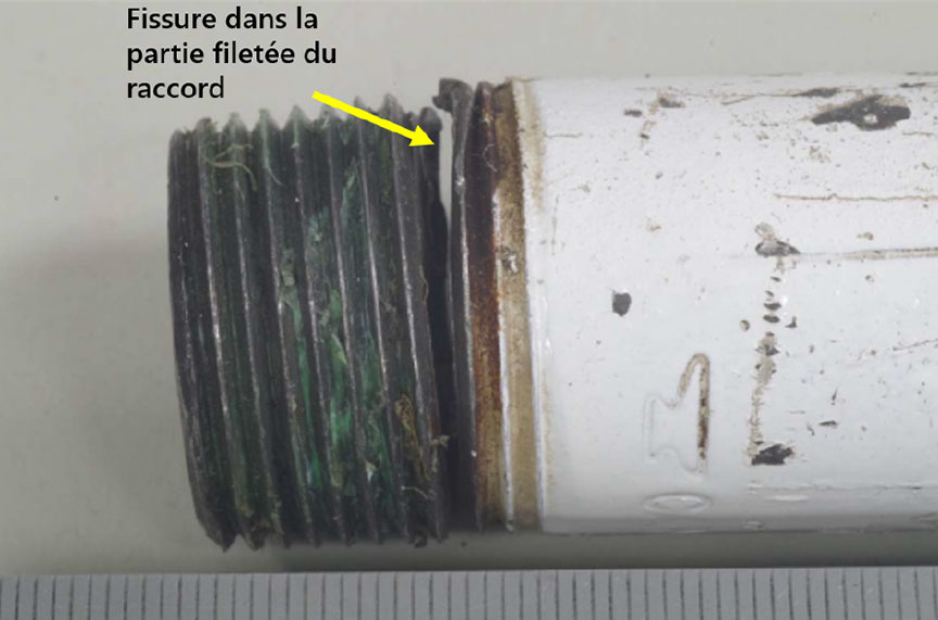 La fissure s'est formée dans la dernière spire du raccord, endroit reconnu pour être soumis à une forte concentration de contraintes. L'emplacement des raccordements sous pression sur le côté du débitmètre aurait soumis le raccord à des forces de flexion additionnelles. Les contraintes élevées concentrées sur les filets, combinées aux forces de flexion additionnelles, ont probablement mené à la rupture du raccord par fatigue, induite par des vibrations.
