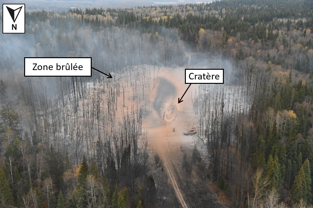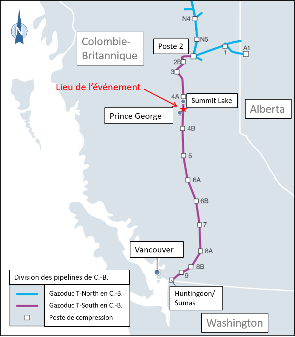 Le 9 octobre 2018 vers 17 h 25, heure avancée du Pacifique,Note de bas de page 1 un gazoduc de 914,4 mm (36 po) exploité par Enbridge Inc. qui transportait du gaz naturel non corrosif s’est rompu à quelque 13 km au nord-est de Prince George, en Colombie-Britannique. À la suite de la rupture, le gaz naturel a pris feu, ce qui a provoqué un incendie. Par mesure de précaution, quelque 125 personnes dans un rayon de 2 km du lieu de l’événement ont été évacuées. Personne n’a été blessé.