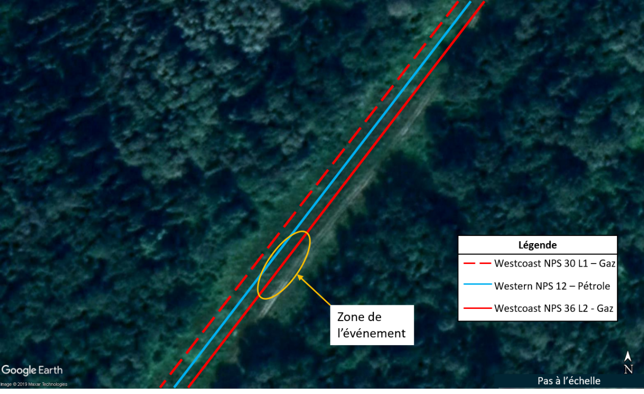 À proximité du lieu de l’événement, un 3e pipeline se trouve dans l’emprise du réseau T-South de Westcoast : l’oléoduc Western NPS 12 pour le transport de pétrole brut, qui appartient à Pembina Pipeline Corporation (Pembina).