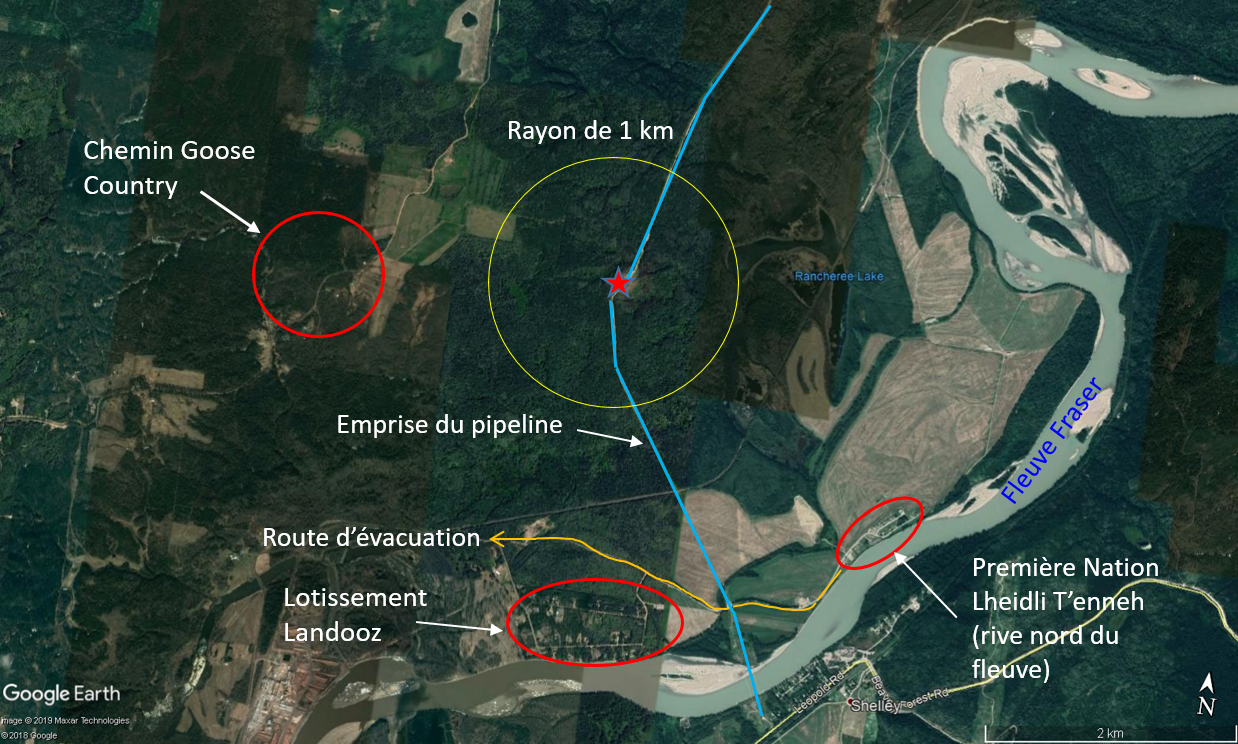 Vers 17 h 45, peu après avoir constaté qu’il y avait un incendie, la communauté de la Première nation Lheidli T’enneh a informé Westcoast de sa décision d’évacuer par mesure de précaution ses domiciles (22 résidences et 1 établissement), situés sur la rive nord du fleuve Fraser, à environ 2,5 km du lieu de l'événement. Les résidents ont évacué en empruntant l’unique route d’accès à la communauté. Peu après, la zone d'évacuation a été élargie pour inclure le lotissement Landooz (33 résidences) et le chemin Goose Country (3 résidences) (Figure 3).