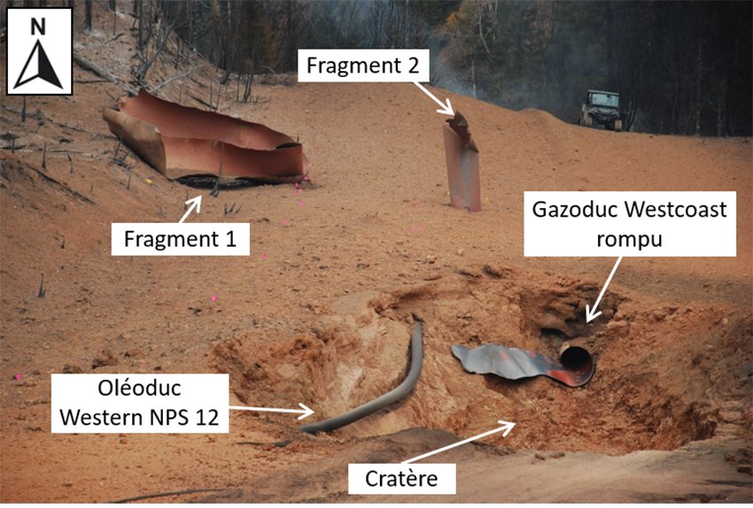 Un fragment (portant l’étiquette « fragment 1 » dans la figure 5) était fendu sur la longueur, avait pris la forme d’un U et avait atterri à environ 25 m au nord-ouest de l'extrémité nord du cratère, au-dessus du gazoduc NPS 30 L1 non exposé. Un second fragment (portant l’étiquette « fragment 2 » dans la figure 5), de forme cylindrique et légèrement comprimé, présentait l’apparence d’une déchirure à son extrémité. Ce fragment avait atterri à la verticale, à 18,5 m au nord de l'extrémité nord du cratère, à l'est de l’oléoduc Western NPS 12. Une partie du fragment 2 était enfouie dans le sol.