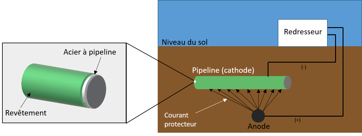 Pour les pipelines enfouis, le contrôle de la corrosion externe est généralement assuré par un système combiné de revêtement externe et de protection cathodique. La fonction première du revêtement externe est de protéger la surface de la conduite de son environnement extérieur. En cas de détérioration ou de défaillance du revêtement, le système de protection cathodique est conçu pour protéger la conduite contre la corrosion (Figure 6).
