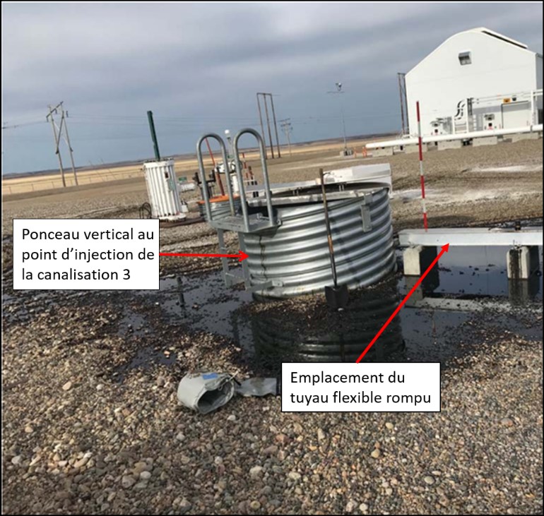 Toutefois, l’étude HAZOP n’a pas permis de déterminer que la conception de la tuyauterie du système d’injection de DRA permettait au pétrole brut de refouler du point d’injection jusqu’au clapet de non-retour. Par conséquent, elle n’a pas non plus permis de déterminer qu’en cas de gel et de bris de la tuyauterie, y compris le tuyau tressé flexible de ¾ de pouce, un déversement de pétrole brut pourrait survenir. Par conséquent, aucune mesure de contrôle n’a été mise en œuvre pour empêcher le déversement de pétrole brut en raison d’un bris de la tuyauterie ou du tuyau tressé flexible de ¾ de pouce.
