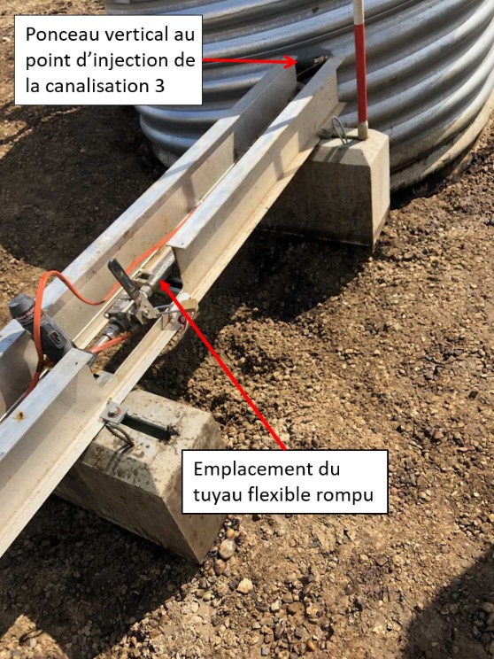 Lorsque les exploitants sur le terrain sont arrivés sur place le lendemain matin, ils ont découvert le déversement provenant du tuyau tressé flexible de ¾ de pouce.
