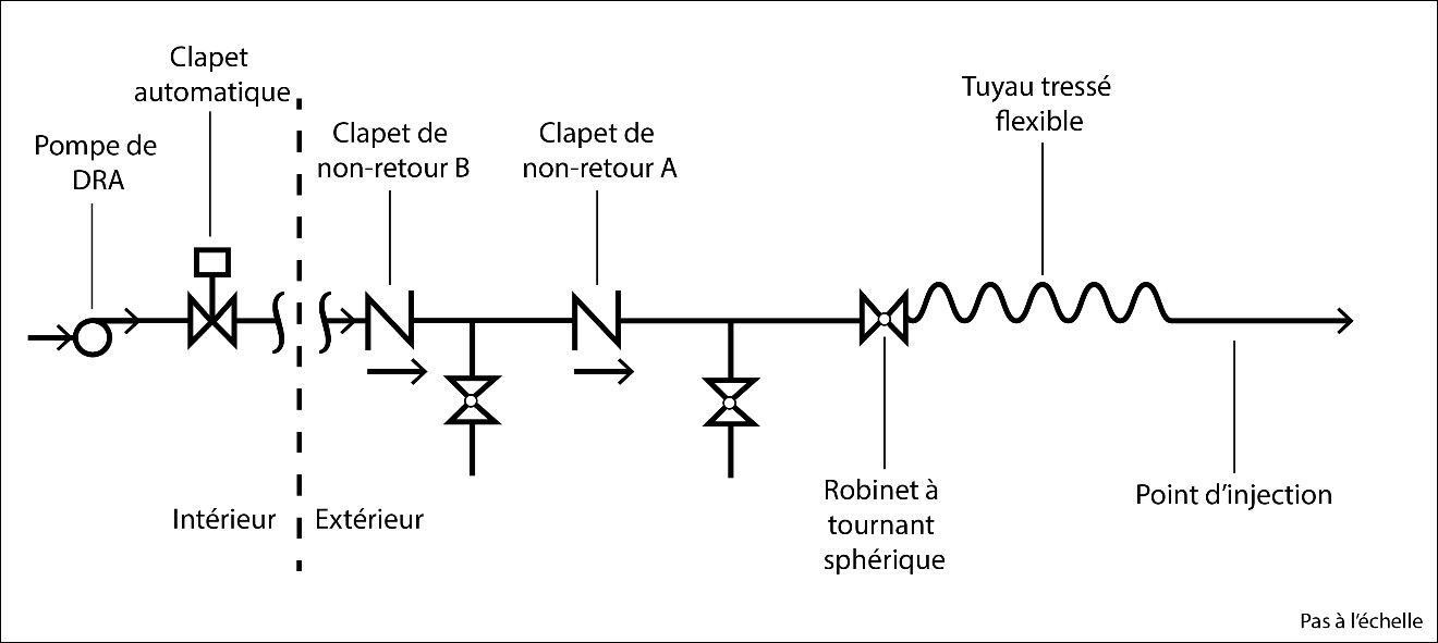 Au moment de l’événement, le système d’injection de DRA n’était pas utilisé. Le 30 avril 2018, le centre de contrôle de l’exploitation d’Enbridge avait isolé la partie intérieure de ce système au niveau du clapet automatique et il était resté isolé depuis. Dans cet état d’exploitation, le tuyau en aval du clapet automatique demeure rempli de DRA, ce qui assure que le système d’injection de DRA est prêt à être utilisé au besoin.