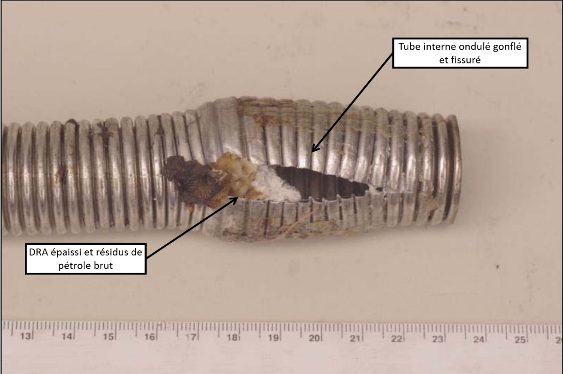 Le tuyau tressé flexible de ¾ de pouce a été retiré, puis envoyé à un laboratoire technique indépendant pour faire l’objet d’un examen approfondi. Un renflement et une fissure d’une longueur d’environ 5 cm ont été décelés sur le tube interne ondulé en acier inoxydable de type 316L du tuyau. La fissure suivait la ligne médiane de soudure sur l’axe longitudinal, dans la section du tuyau adjacente au robinet à tournant sphérique. À l’emplacement du renflement, le tuyau était bouché avec un matériau semi-solide composé de DRA épaissi et de résidus de pétrole brut (figure 5). Il est probable que le tout ait gelé lorsque le système de réchauffage des conduites a subi une défaillance.