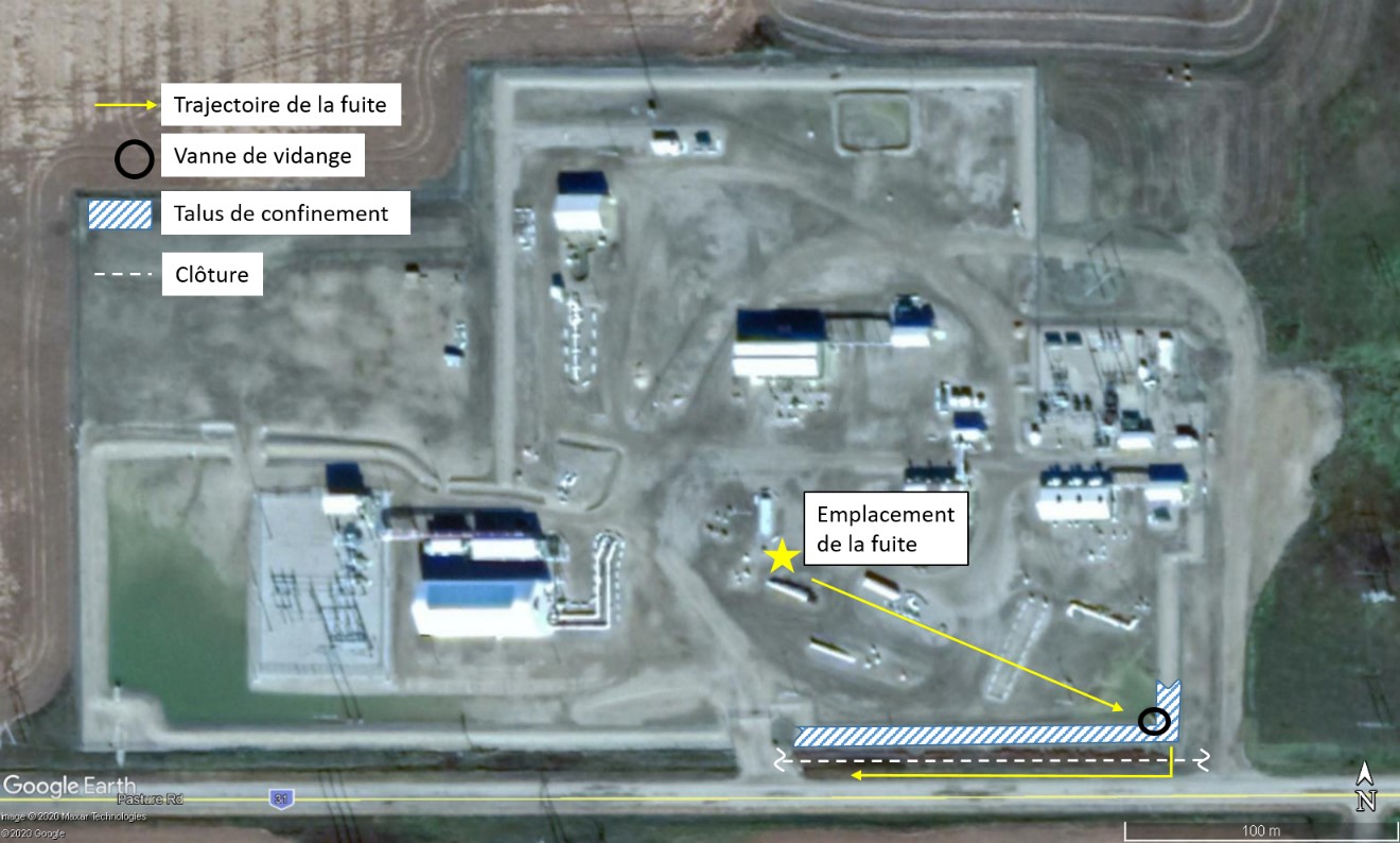 Le pétrole brut s’est écoulé à l’extérieur du site par une vanne de drainage ouverte, qui sert à drainer de la station vers un fossé adjacent les eaux de pluie accumulées.