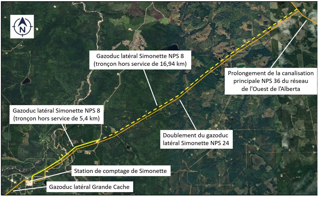 Le gazoduc latéral Simonette NPS 8 fait partie du réseau de NGTL, un réseau de collecte et de transport de gaz naturel situé en Alberta et dans le nord-est de la Colombie-Britannique (figure 5). NGTL transporte le gaz naturel produit dans le bassin sédimentaire de l’Ouest canadien vers des marchés du Canada et des États-Unis.
