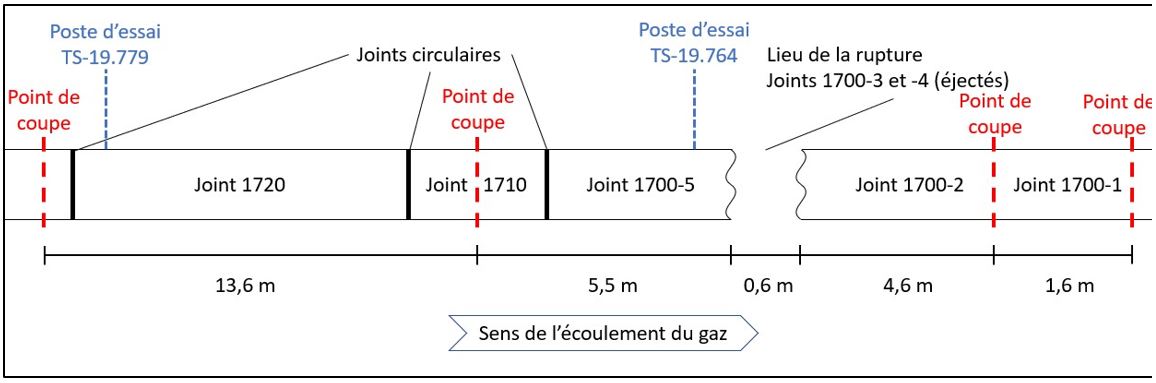 Environ 25 m de matériau de conduite récupéré sur les lieux de l’événement ont été transportés au laboratoire d’Acuren Group Inc. (Acuren) à Edmonton (Alberta) aux fins d’analyse. Le matériau de conduite comprenait des parties des joints de conduite 1700, 1710 et 1720 (figure 7). Les composants du système de protection cathodique récupérés des postes d’essai TS-19.779 et TS-19.764 ont été transportés au Laboratoire d’ingénierie du BST à Ottawa (Ontario) aux fins d’analyse.