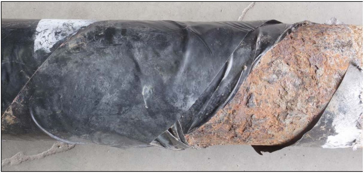 Les tronçons de conduite récupérés ont été examinés afin de déterminer l’état du revêtement et l’étendue de la corrosion externe. Le revêtement externe a été installé à l’origine sur le terrain en appliquant un adhésif sur la conduite, puis en enroulant un ruban de polyéthylène en forme de spirale.